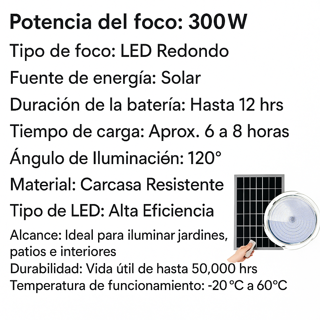 Este foco solar de 300W es ideal para quienes buscan una solución económica, eficiente y fácil de instalar para iluminación.